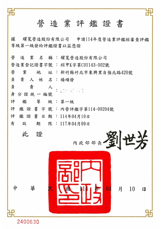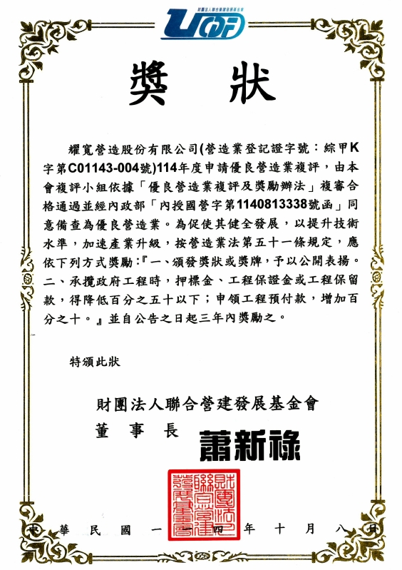 耀寬營造股份有限公司114年度申請優良營造業複評,由財團法人聯合營建發展基金會複評小組依據「優良營造業複評及獎勵辦法」複審合格通過並經內政部同意備查為優良營造業。